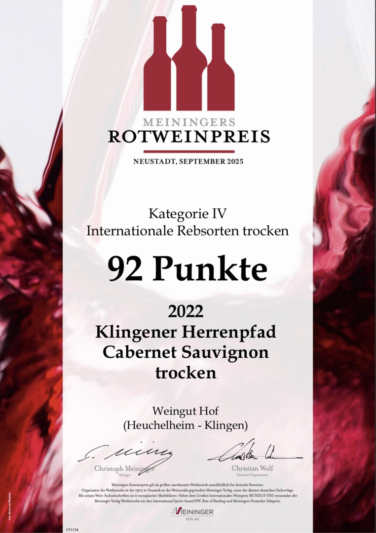 Mit 92 Punkten wurde unser "Klingener Herrenpfad Cabernet Sauvignon - trocken (2022)" in diesem Jahr beim "Meininger Rotweinpreis" ausgezeichnet. Auch der "Klingener Herrenpfad Spätburgunder - trocken (2023)" schaffte es mit 90 Punkten ausgezeichnet zu werden.